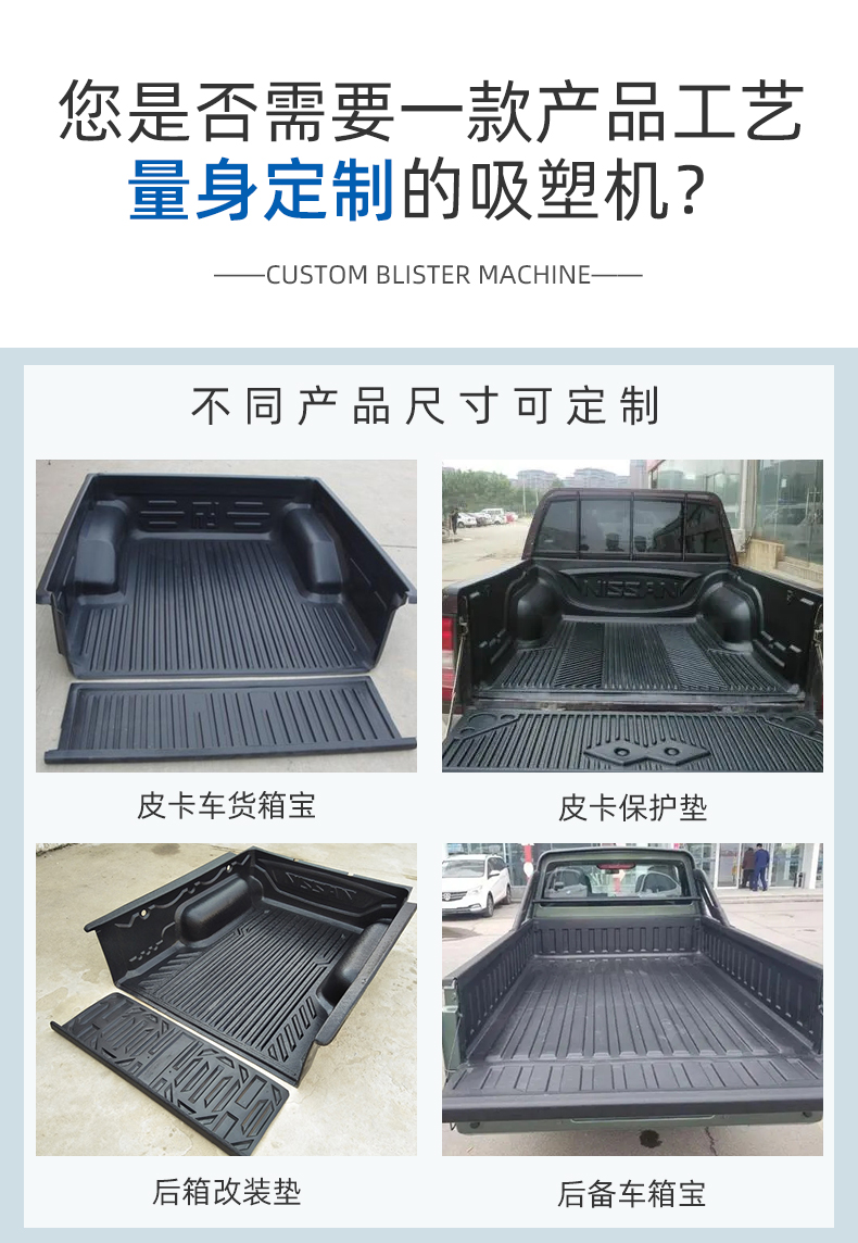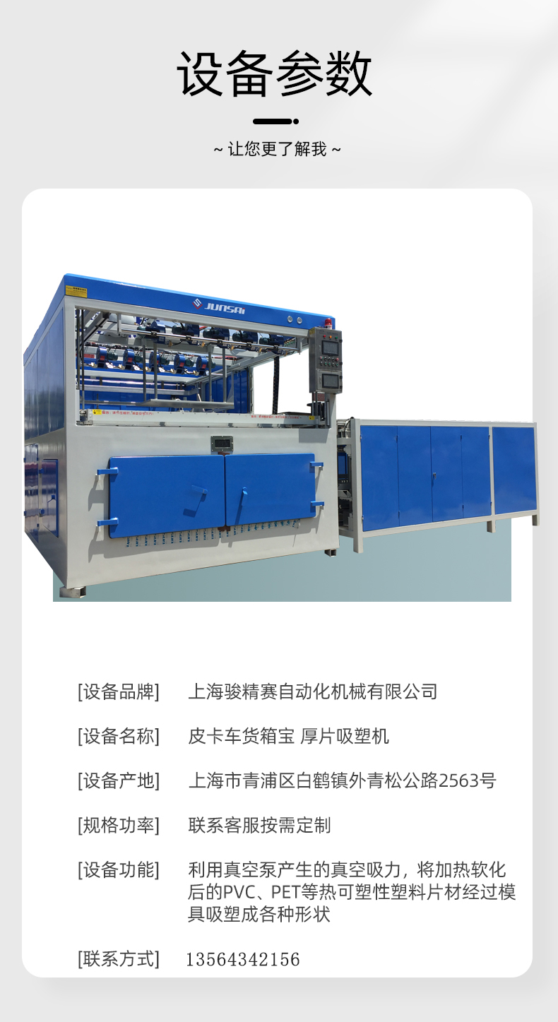 相關(guān)推薦 汽車(chē)通風(fēng)管全自動(dòng)雙層厚片吸塑機 江蘇駿精賽自動(dòng)上下料吸塑設備 皮卡車(chē)貨箱寶厚片吸塑機 潮汐苗床厚片吸塑機 種植養殖苗床厚片吸塑成型設備 廠(chǎng)家供應咨詢(xún)客服可免費試樣工藝